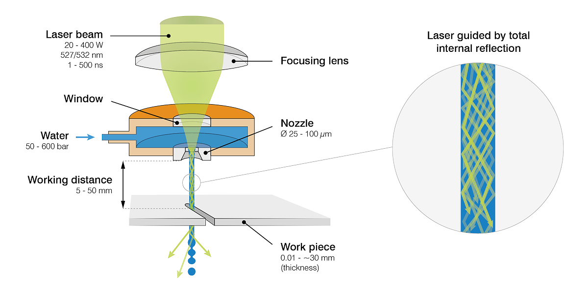 The Laser MicroJet (LMJ) is a hybrid method of machining, which combines a laser with a “hair-thin” water jet that precisely guides the laser beam by means of total internal reflection in a manner similar to conventional optical fibers. The water jet continually cools the cutting zone and efficiently removes debris.